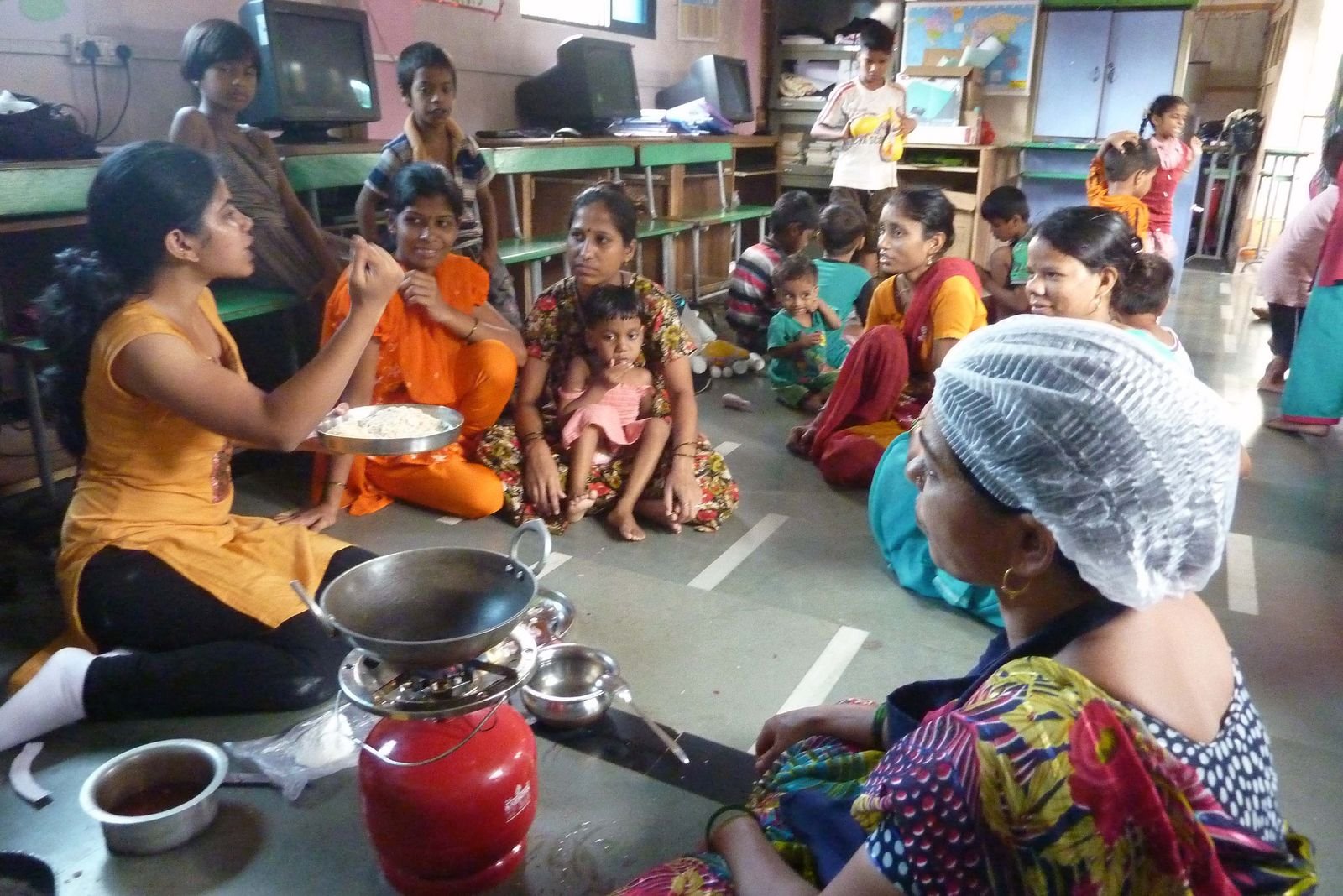 FMCH runs a weekly clinics at the Reality Gives’ community centre in Dharavi on Saturday afternoons. On alternate Saturdays a cooking demonstration is held or a talk about issues the participants would like to discuss. This Saturday was cooking time! The knowledgeable and energetic Sneha Rout, a FMCH nutritionist, led last Saturday’s cooking demonstration. Four mothers with their numerous children gathered round to listen and learn about the recipes Sneha was preparing with the help of Nanda Goregaokar, a part-time FMCH cook. Nazia and Sangeeta, Library and Youth Empowerment Program teachers with Reality Gives helped facilitate the clinic, providing water, cleaning cooking utensils and managing the crowd of children who had gathered. They both are from Dharavi as well and know the attending women and children very well. Most of them participated in other projects of Reality Gives before.